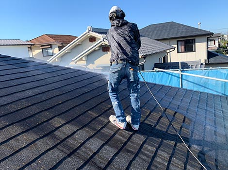 屋根にはエポキシシーラーをじっくりしみこませるように塗布。屋根の劣化を防ぎ、塗料との密着度を高めます。